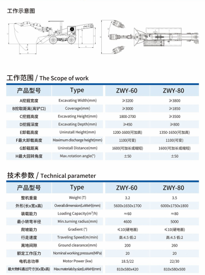 ZWY-60/80 轮式输送带挖掘式装载机是一种连续生产的高效率出矿设备。主要用于空间狭窄的 洞采作业,如好色先生污污污黄色,非好色先生污污污黄色,引水巷道等。